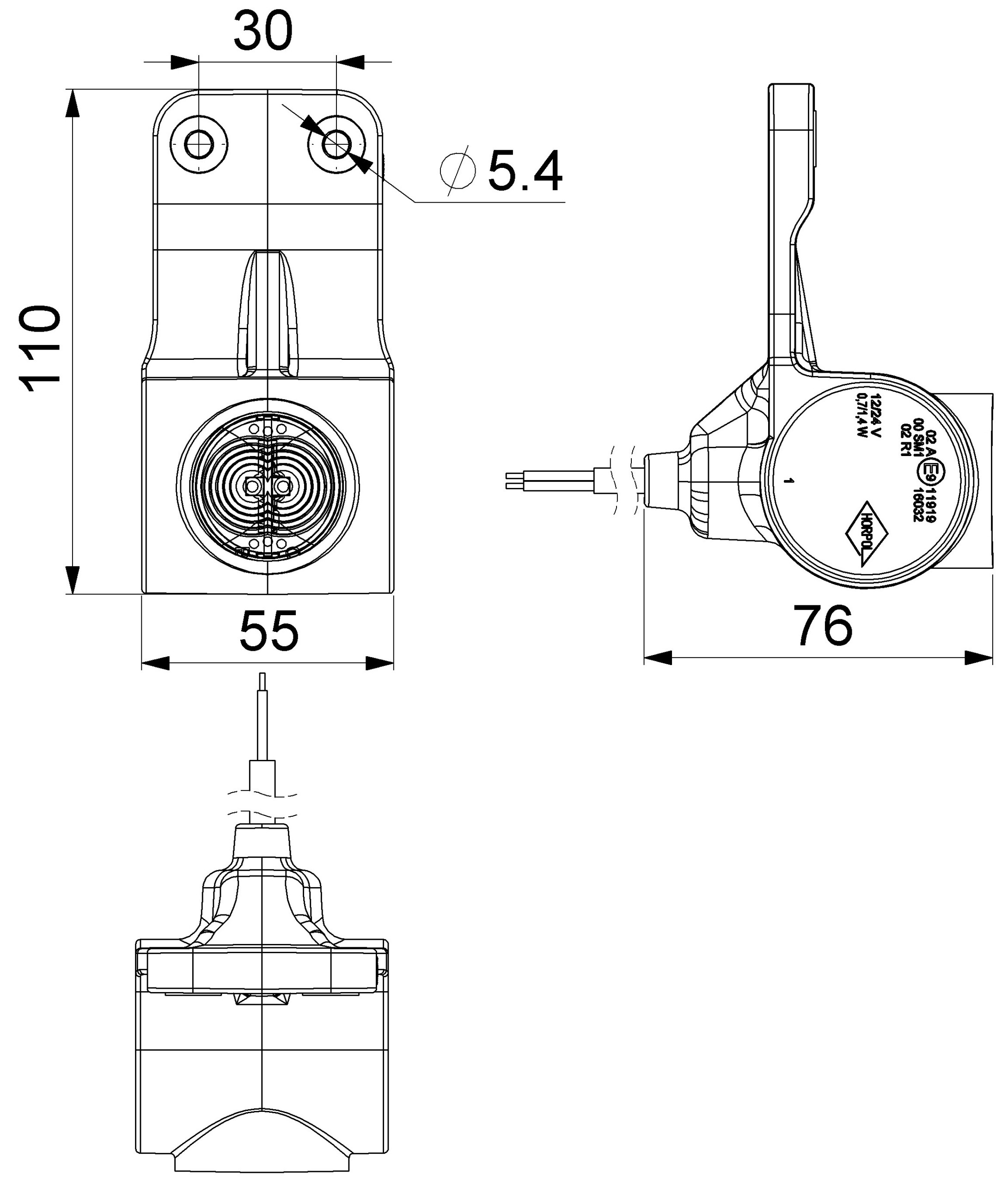 LD 3110/P is a triple marker lamp that comes with a flexible hanger and compact dimensions. It is specifically designed for mounting on the right side of the vehicles, ranging from small trailers to trucks and trailers.